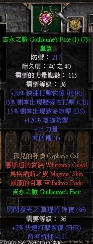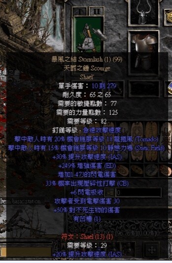 先顺便提下属性点的加法。力量够装备,敏捷到格挡75,其余全体力,很传统。装备大部分都不值钱,我用了tp+,其实ASN k6boss tp+并不是很好的选择,刚毅是最好的,强制也不错,他们的伤害,防御,抗性都不比tp+差。我用tp+纯粹是为了tp方便,不需要tp号辅助。整套装备如果不考虑tp+很便宜,所以ASN kboss的成本不高。武器选择了暴风之结,本人的大爱,33CB,30ias,基础速度也不错,高频率触发静电力场,旁边一群小怪也会跟着boss一起掉血,还有吸电!用起来感觉实在很爽。然后是暴风盾,cb头,卓古拉,食肉鞋,马拉,乌鸦,双吸戒指,技能腰带。