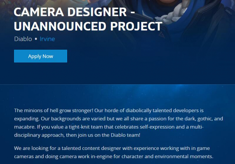 今天暴雪发布了暗黑x项目”镜头设计师“的职位招募广告,这一职位在通常的游戏设计师招聘中是不太常见的。这个位置将负责游戏内的镜头以及游戏引擎渲染的过场动画里的镜头设计。