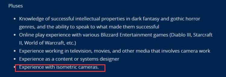 在加分项中强调了对黑暗奇幻和哥特式恐怖类型游戏的理解,还有特别有意思的一点是应聘者需要”有使用等距视角镜头的经验“。这从另一个角度印证了去年Kotaku爆料中所称的暗黑x项目废弃了第三人称越肩视角,转而拾起暗黑传统的等距视角的做法。