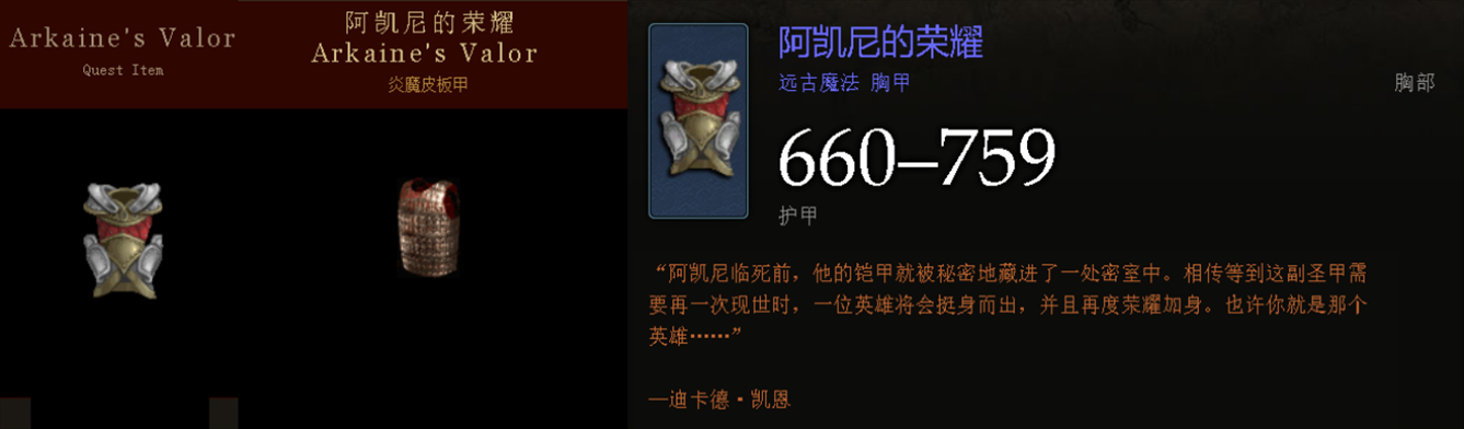 其次,则是一件名为“阿凯尼的荣耀”的铠甲。据迪卡德·凯恩所说,阿凯尼是远古时期的人类英雄,在原罪之战期间第一个杀入烈焰地狱的勇士——从日后泰瑞尔提供的文献中我们可以推断出,阿凯尼很有可能是当时觉醒了奈非天之力的众多凡人之一。