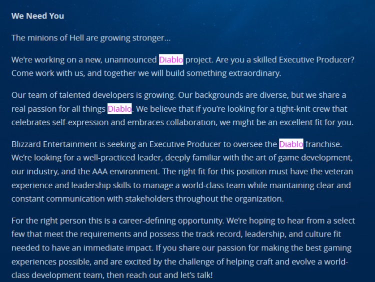去年的暴雪嘉年华公布的《暗黑》手游——《暗黑破坏神:不朽》并没有让暗黑玩家足够满意。但一款新的《暗黑》游戏,从暴雪官网的招聘信息看,很可能是《暗黑4》,目前正在制作中。