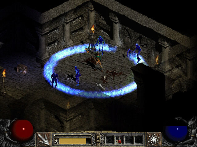 冰弹[1], 冰封装甲[1], 霜之新星[6], 冰风暴[6], 碎冰甲[12], 冰尖柱[18], 暴风雪[24], 寒冰装甲[24], 冰封球[30], 支配冰冷[30] 法师的范围性攻击的技能(如暴风雪等)的效果可以累积. 重叠施放两三个暴风雪的伤害效果与间隔施放同样数量的暴风雪的效果是一样的. 注意敌人的法术效果也是如此. 冻结与减慢目标 冰封装甲 vs 碎冰甲 vs 寒冰装甲 在对冰系装甲升级时, 你需要考虑以下因素: 在较高难度中你会经常跑动, 而跑动中防御为 0, 你会很容易地被远程攻击击中; 另外可, 冰冻时间在噩梦难度减少至 1/2, 在地狱难度减少至 1/4.
